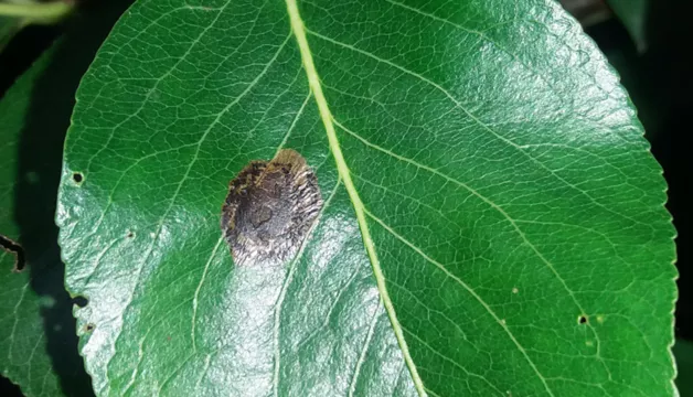 Motyl ma skrzydła o rozpiętości 6-8 mm. Skrzydła przednie są metaliczne z plamami w kolorach miedzianym, czarnym i amarantowym. Jajo elipsowate, przezroczyste, a później seledynowe. Larwa osiąga długość do 3,5 mm i jest koloru jasnozielonego. Na górnej stronie liści są widoczne okrągłe miny z koncentrycznie ułożonymi ciemnymi smugami odchodów gąsienic. Na jednym liściu może być kilka, kilkanaście, a nawet kilkadziesiąt min.